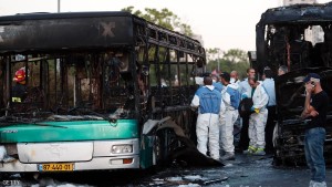 وأظهرت لقطات تلفزيونية دخانا يتصاعد من حافلتين محترقتين ويبدو أن النيران انتقلت من إحداهما إلى الأخرى بمنطقة في جنوب غرب القدس قريبة من الحدود مع الضفة الغربية المحتلة.
