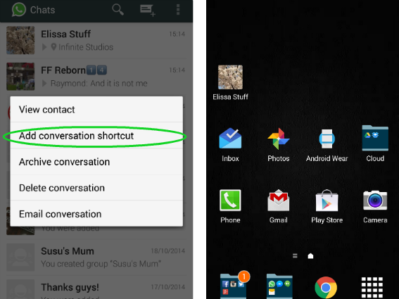 إذا كان هناك بعض الأشخاص الذين تتحدث إلىهم كثير من الأحيان، فإنه قد يكون فكرة جيدة لإنشاء اختصارلها على الشاشة الرئيسية مباشرة، لذلك فانت لاتحتاج لفتح والواتس اب للتحدث معهم. لعمل الاختصار انقر مع الاستمرار على محادثة معينة ( جماعة – فرد ) ثم قم باختيار Add Conversation shortcut او عمل اختصار للدردشة .