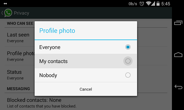 الان يمكنك اخفاء صورتك على حساب الواتس اب عن طريق الذهاب الى الاعدادات >الحساب > الخصوصية > صورة الملف الشخصي Settings <account <Privacy <Profile Photo وتغيرها الى من تريده ان يري صورة الملف الشخصي الخاص بك .