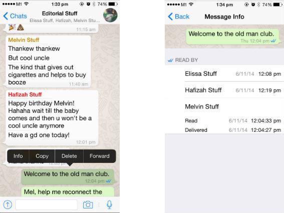 بالضغط مع الاستمرارعلى اي من رسائلك ثم تختار Message info سوف تتعرف علي متي تم ارسال رسالتك ومتي تم قراءتها ومن الذي قام بقراءتها فى حالة Group Conversation .