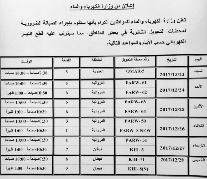 أعلنت وزارة الكهرباء والماء عن إجراء صيانة لمحطة الكهرباء الثانوية في الفروانية قطعة واحد من الساعة 7:30 إلى 10 وخيطان قطعة سبعة من الساعة 10:30إلى 1 ما سيترتب عليه انقطاع للتيار الكهربائي.
