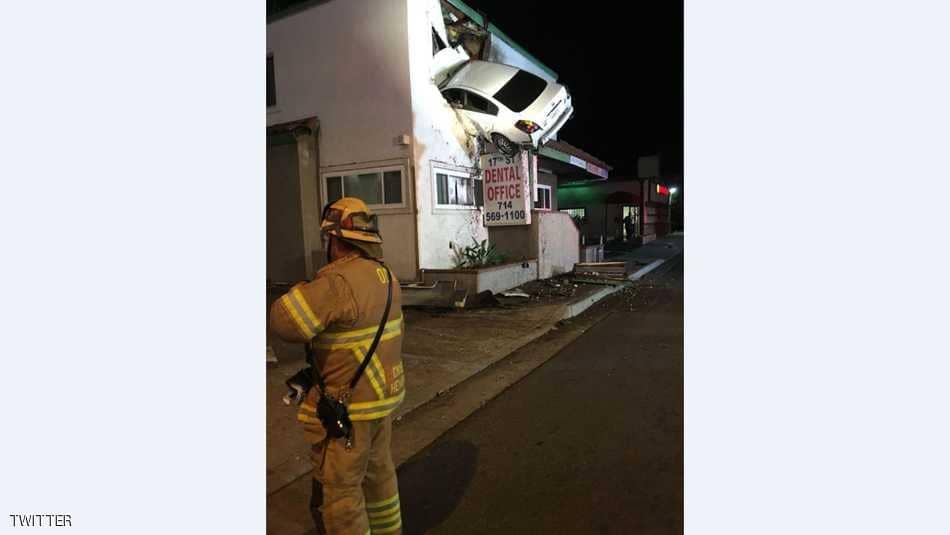 حطم سائق سيارة في ولاية كاليفورنيا كل قواعد المرور، والطبيعة أيضا، عندما طارت سيارته في الهواء واخترقت جدار الطابق الثاني في مبنى على جانب الطريق.