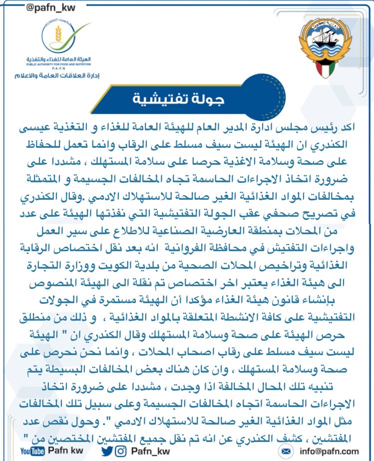 شنت الهيئة العامة للغذاء والتغذية جولة تفتيشية بقيادة رئيس مجلس الإدارة المديرالعام عيسى الكندري ونائب المدير العام لشؤون التفتيش والرقابة د.أمل الرشدان وعدد من مدراء الهيئة على محافظة الفروانية-العارضية الصناعية ، وفيما يلي التفاصيل :