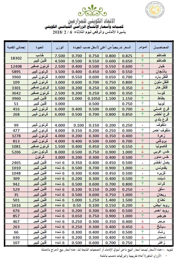 نشر اتحاد المزارعين قائمة بأسعار المنتج النباتي الكويتي من الخضراوات والفواكه في حراج شبرة الأندلس والرقعي اليوم الثلاثاء، كما في الصورة المرفقة.