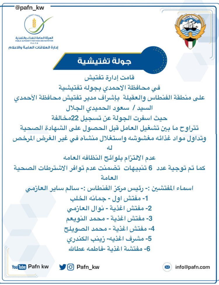 شن فريق إدارة التفتيش مركز ضاحية صباح السالم بمحافظة مبارك الكبير في الهيئة العامة للغذاء والتغذية جولة تفتيشية علي سلسلة مطاعم الطريق الساحلي و منطقة ضاحية صباح السالم بالمحافظة ، وفيما يلي ما اسفرت عنه :