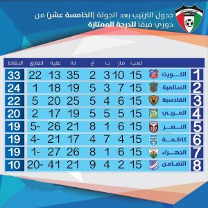 جدول ترتيب دوري كرة القدم للدرجة الممتازة بعد نهاية الجولة الخامسة عشر