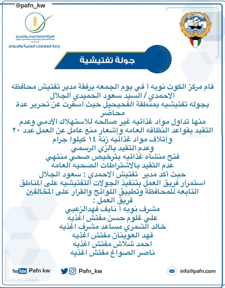 بقيادة مدير تفتيس محافظة الاحمدي سعود الحميدي الجلال قام مركز الكوت نوبة(أ) التابع إلى الهيئة العامة للغذاء والتغذية بجولة تفتيشية بمنطقة الفحيحيل حيث أسفرت عن تحرير عدة محاضر.