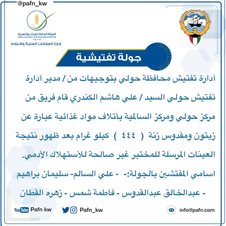 قالت الهيئة العامة للغذاء والتغذية عبر صفحتها على تويتر لقد قام فريق عمل مركز الفحيحيل الفترة الصباحية بتوجيهات مدير محافظة الاحمدي سعود الحميدي الجلال على منطقة الفحيحيل.