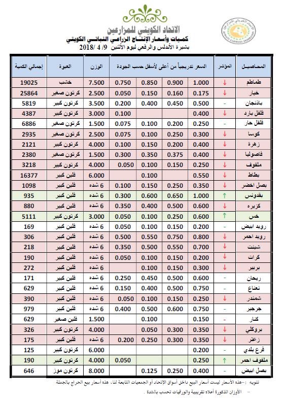صورة لقائمة أسعار المنتج النباتي الكويتي من الخضراوات والفواكه في حراج شبرة الأندلس والرقعي اليوم، وفقا لما نشره اتحاد المزارعين الكويتيين.