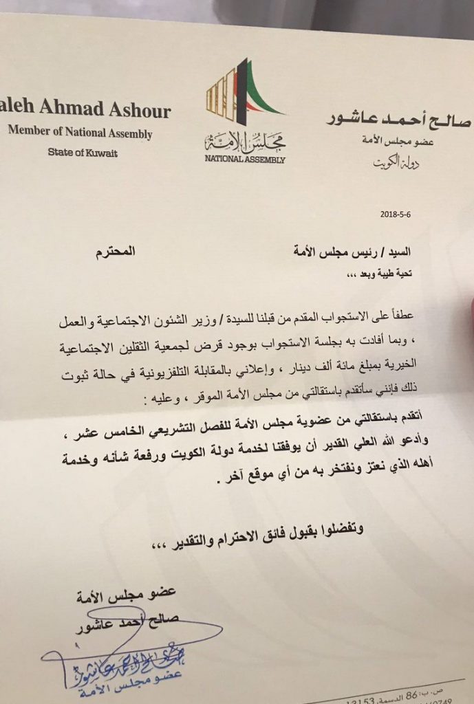 صورة لكتاب استقالة النائب صالح عاشور من مجلس الأمة والذي أعلن أنه سيقدمه بشرط إذا أثبتت وزيرة الشؤون بأن جمعية الثقلين حصلت على قرض بمبلغ 100 ألف دينار.