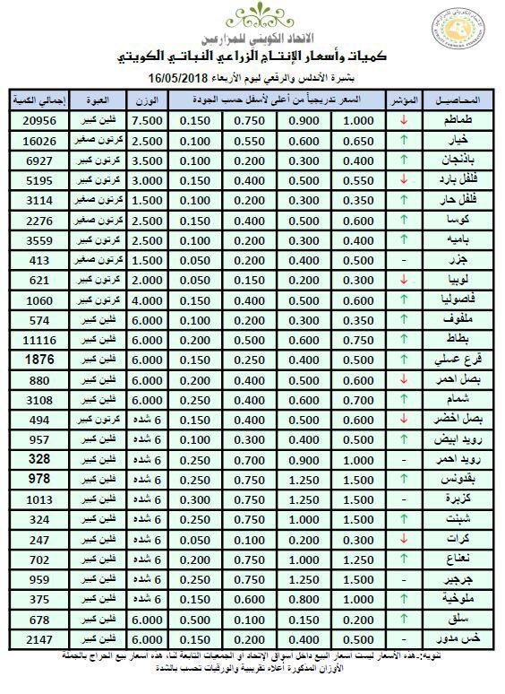 صورة لقائمة أسعار المنتج النباتي الكويتي من الخضراوات والفواكه في حراج شبرة الأندلس والرقعي اليوم، وفقا لما نشره اتحاد المزارعين الكويتيين.
