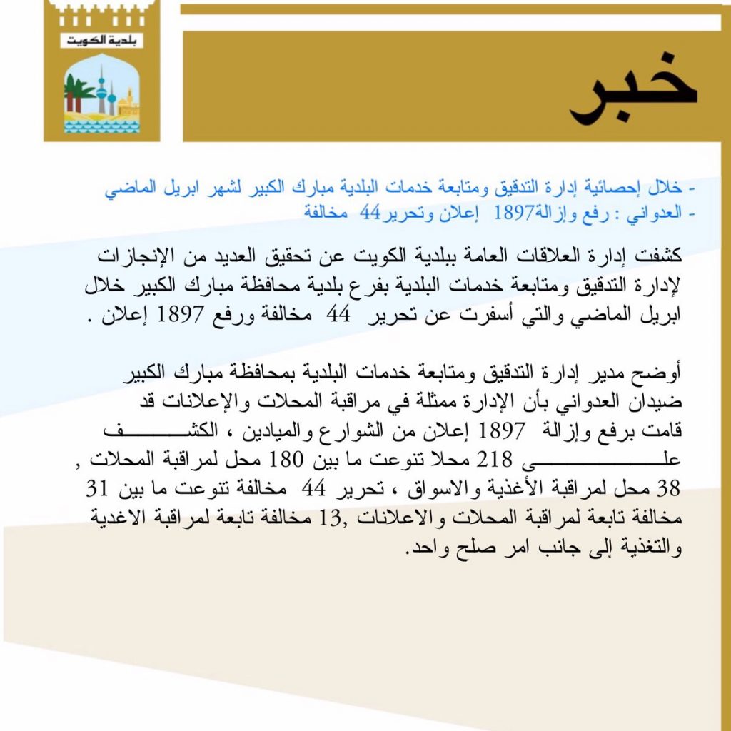 رفع وإزالة 1897 إعلان وتحرير 44 مخالفة بـ #مبارك_الكبير .. ابريل الماضي