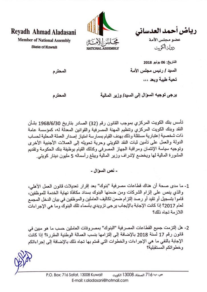 قال عضو مجلس الأمة رياض العدساني عبر صفحته على تويتر لقد تقدمت بسؤال برلماني لوزير المالية بشأن رقابة بنك الكويت المركزي على البنوك ومدى إلتزامها بتنفيذ قانون العمل في القطاع الأهلي وتعديلاته فيما يخص:
