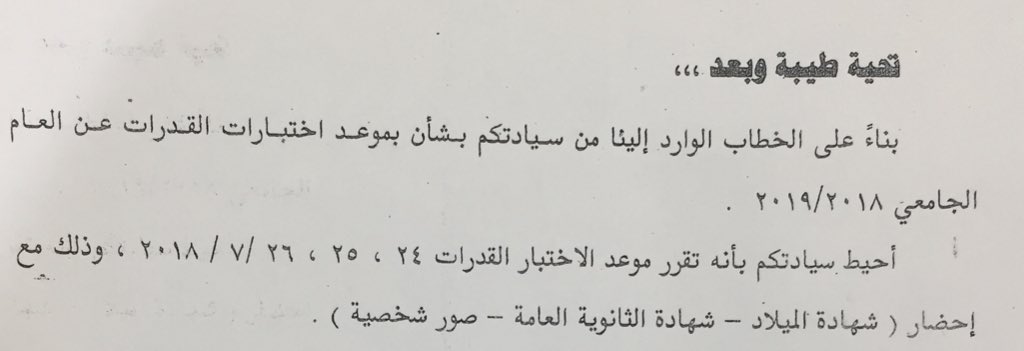 اعلن المكتب الثقافي لسفارة الكويت بالقاهرة على صفحته الرسمية عبر تويتر عن موعد اختبار القدرات للطلبة الراغبين في الالتحاق بكليات التربية النوعية بالعام الجامعي 2019/2018 وقاموا بالتسجيل بموقع الادارة العامة للوافدين والحاصلين على اجازة دراسية ، تبدأ الاختبارات اعتبار من يوم 2018/7/24 وتنتهي في 2018/7/26 بجامعة القاهرة .