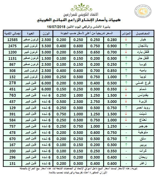 صورة لقائمة أسعار المنتج النباتي الكويتي من الخضراوات والفواكه في حراج شبرة الأندلس والرقعي اليوم، وفقا لما نشره الاتحاد الكويتي للمزارعين.