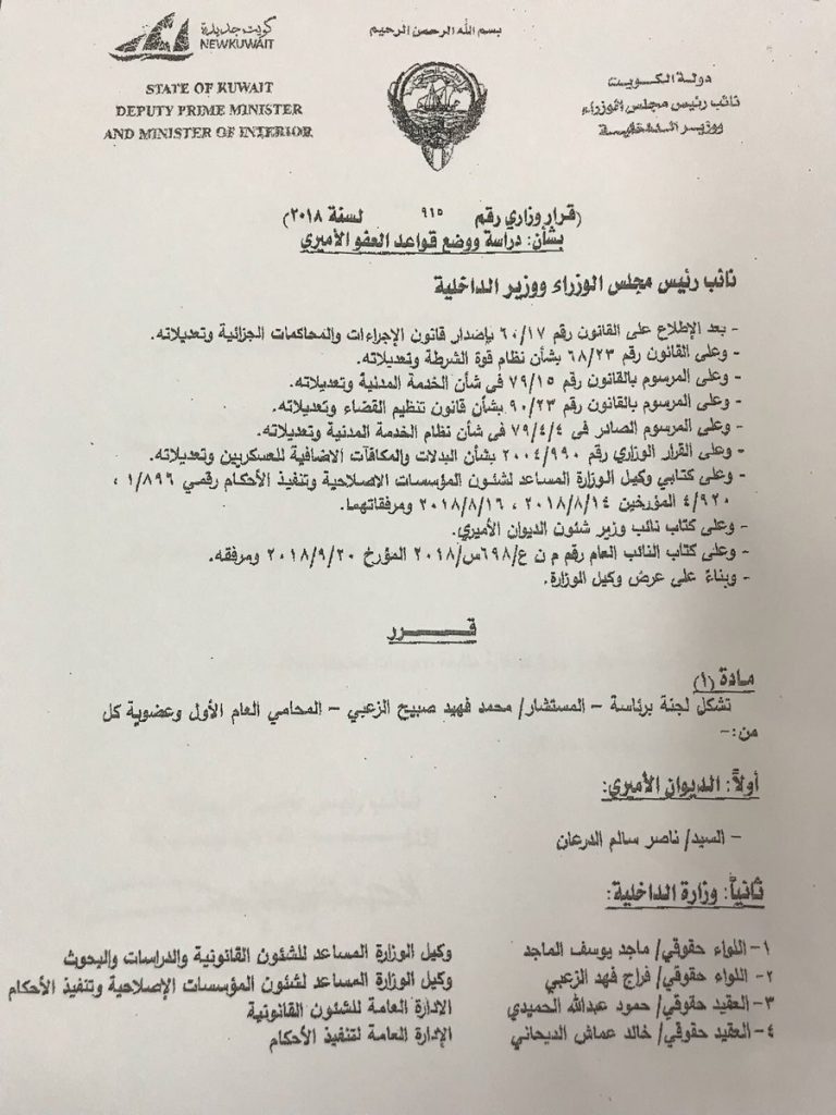 كشف مصدر عن صدور قرار من وزير الداخلية الشيخ خالد الجراح بتشكيل لجنة برئاسة المستشار محمد الزعبي ووكلاء مساعدين من وزارة الداخليه وضباط حقوقيين لدراسة ووضع قواعد العفو الأميري للسجناء.
