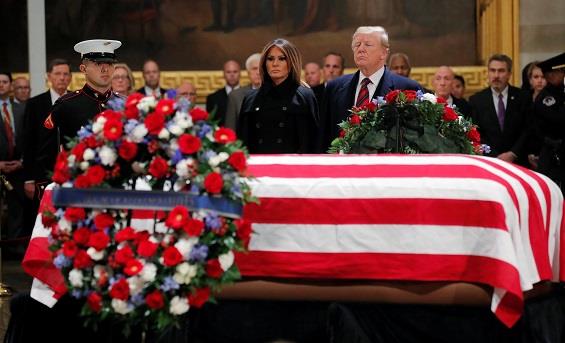 ألقى الرئيس الأمريكي دونالد ترامب وزوجته ميلانيا نظرة الوداع الأخيرة، على الرئيس الـ41 للولايات المتحدة، جورج هيربرت ووكر بوش، مساء أمس، حيث سجى جثمانه في مبنى الكابيتول بواشنطن، ملفوفاً بالعلم الأمريكي، استعداداً لحفل تكريم وطني رسمي.