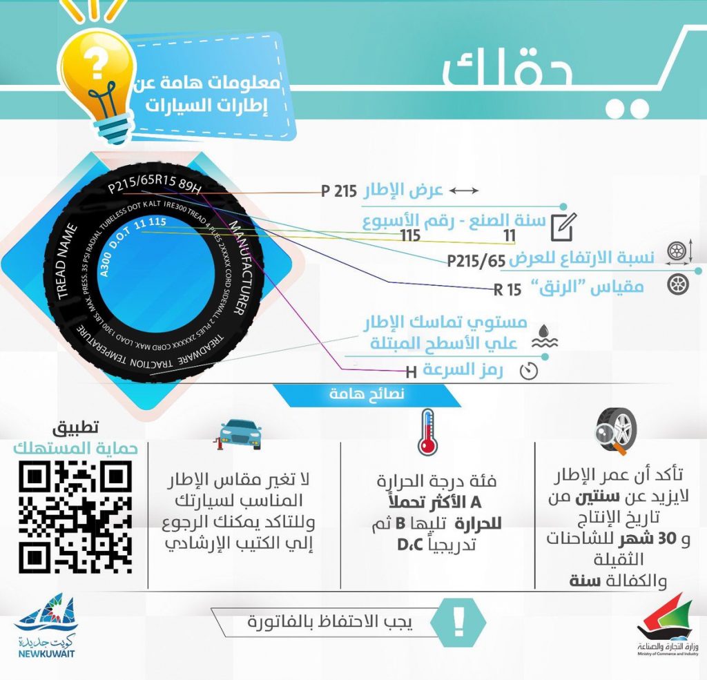 نشر قطاع حماية المستهلك عددا من النصائح والمعلومات يستفيد منها المواطن والمقيم قبل شراء إطار سيارة، ومنها عرض الإطار وسنة الصنع ورقم الأسبوع ونسبة الارتفاع للعرض ومقياس “الرنق” وغيرها، كما في البيان المرفق.