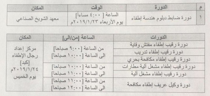أعلن مركز اعداد رجال الإطفاء موعد اللقاء التنويري للطلبة الجدد، علما بأن الدوام الرسمي لجميع الطلبة المقبولين بالدورات سيكون الأحد 27 يناير الجاري الساعة 8 صباحا، وذلك وفق الجدول المرفق: