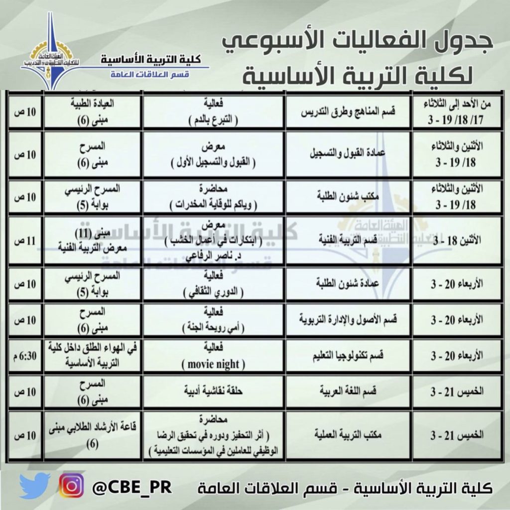 أعلنت كلية التربية الأساسية جدول الفعاليات الأسبوعي والذي جاء كالتالي: