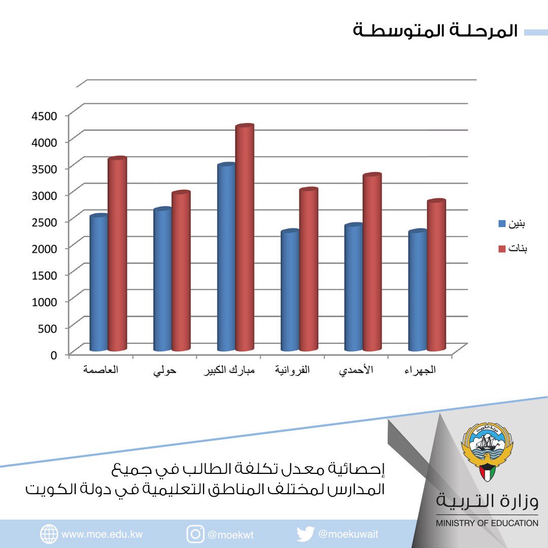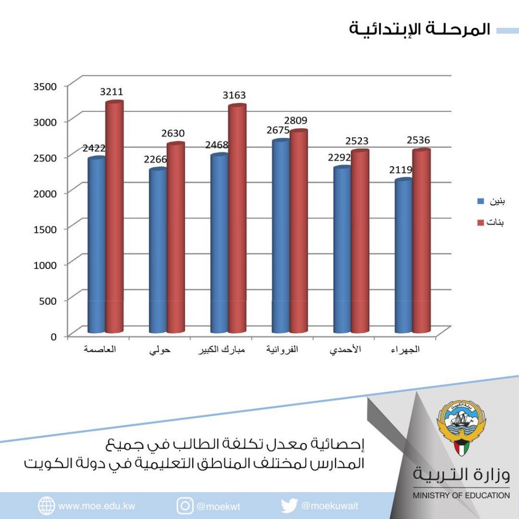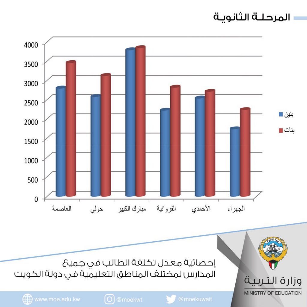 أصدرت إدارة التخطيط بقطاع المنشآت التربوية والتخطيط دراسة لمعدل تكلفة الطالب في جميع المدارس لمختلف المناطق التعليمية في دولة الكويت للعام الدراسي 2018/2019