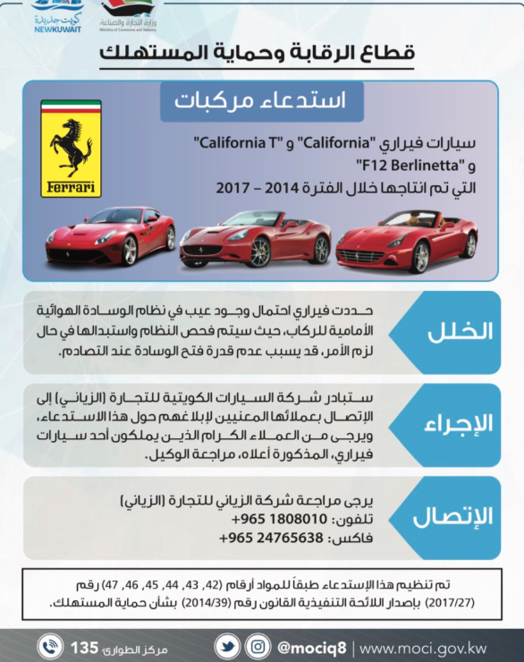 أعلن قطاع حماية المستهلك والرقابة التجارية بوزارة التجارة استدعاء عدد من سيارات فيراري لوجود عيوب تصنيع وفقا لما يلي