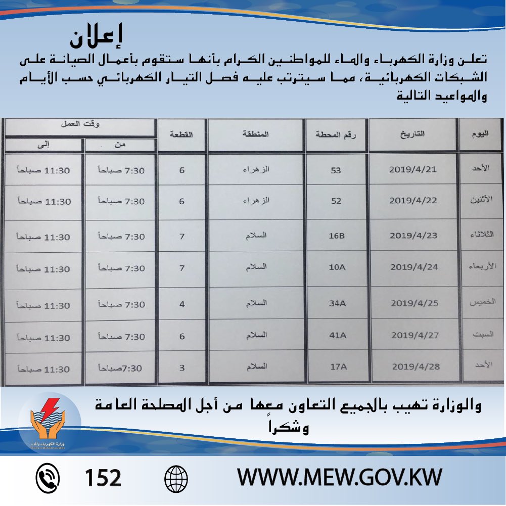 أعلنت وزارة الكهرباء والماء للمواطنين أنها ستقوم بأعمال الصيانة على الشبكات الكهربائية بمنطقتي الزهراء والسلام، مما سيترتب عليه فصل التيار الكهربائي حسب الأيام والمواعيد التالية: