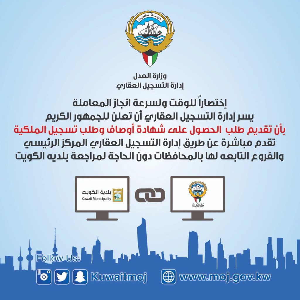 أعلنت وزارة العدل عن توفير خدمة الحصول على شهادة اوصاف وتسجيل الملكية في إدارة التسجيل العقاري، دون مراجعة بلدية الكويت، كما في البيان التالي.