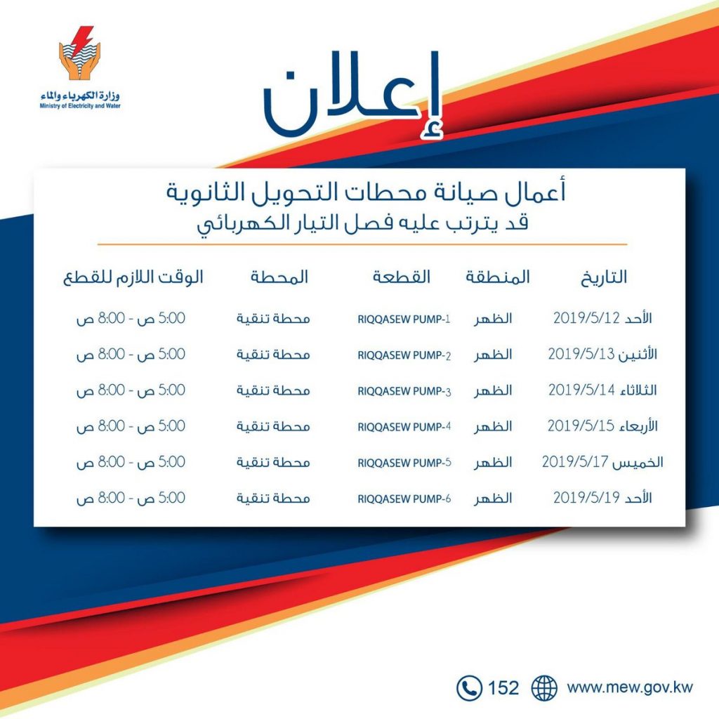 تعلن وزارة الكهرباء والماء أعمال صيانة محطات التحويل الثانوية قد يترتب عليه فصل للتيار الكهربائي حسب الجدول المبين