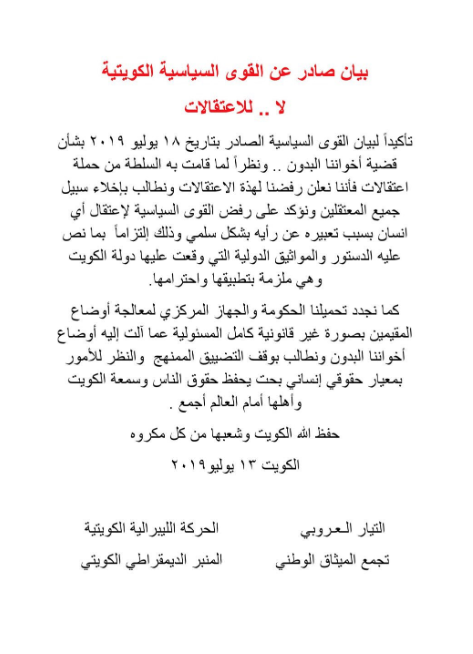 أصدرت أربع قوى سياسية هي المنبر الديمقراطي والتيار العروبي وتجمع الميثاق الوطني والحركة الليبرالية بيانا جديدا حول القبض على عدد من البدون جاء فيه