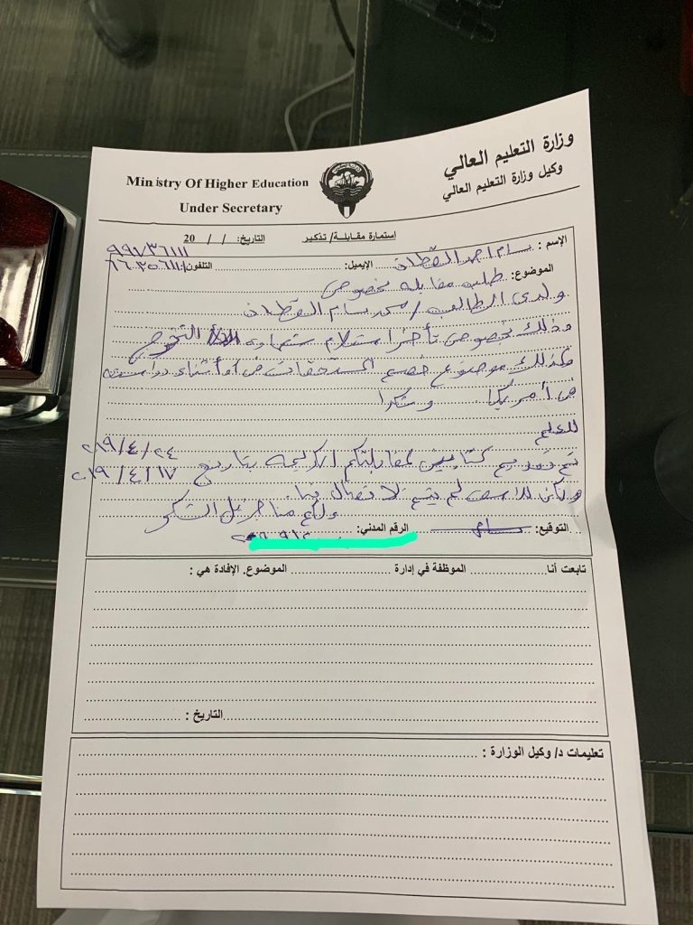 ويطلب المواطن مقابلة وكيل وزارة التعليم العالي بخصوص الحصول على شهادة ابنه، وبحث مسألة خصم المستحقات أثناء الدراسة، كما هو في الصورة.