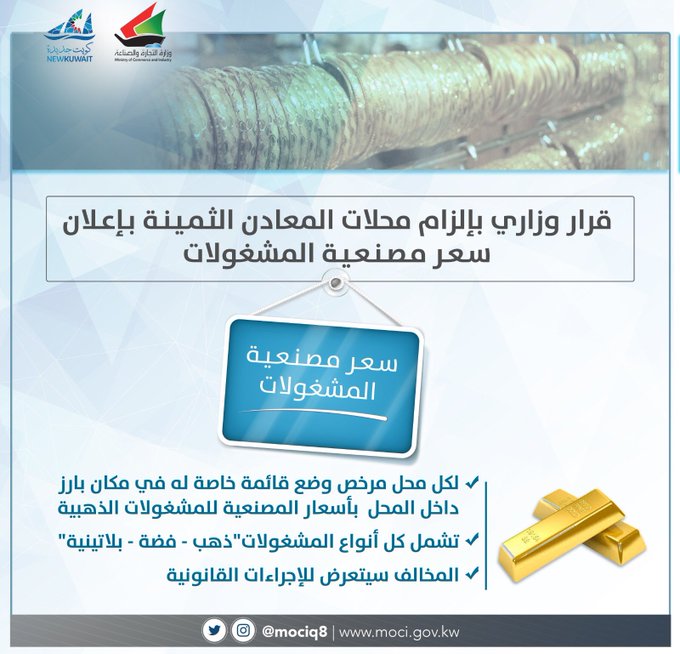 نشرت وزارة التجارة والصناعة بيانا عن قرار وزاري بإلزام محلات المعادن الثمينة بإعلان سعر مصنعية المشغولات، كما في الصورة التالية.
