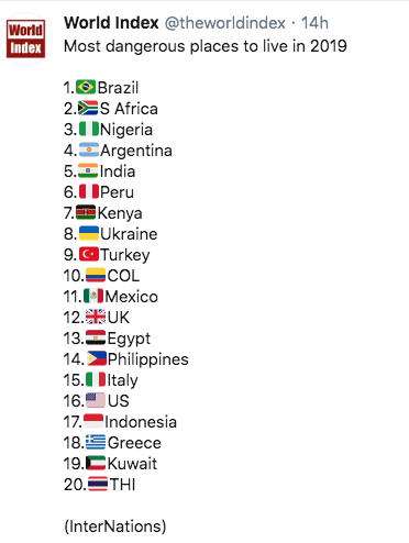 وفقا لموقع worldindex اختارت إحدى الشركات العالمية للاستشارات الكويت ضمن أخطر الدول للعيش فيها، وحلت في المرتبة 19 فيما جاءت البرازيل في الصدارة وكان لافتا أن تكون بريطانيا رقم 12 بالقائمة والولايات المتحدة في المرتبة 16 وتركيا التاسعة.
