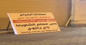 وتداول رواد المواقع الإلكترونية مقطع فيديو، يظهر لافتة وضعت أمام المطعم، وكتب عليها: «عملائنا الكرام.. مطعم شاورما صح ليس مغلقًا للتحسينات، بس معلم الشاورما راح يتزوج»