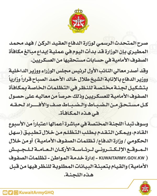 وتبدأ اللجنة المختصة في مباشرة أعمالها اعتباراً من الأسبوع القادم، ويمكن التقدم بطلب التظلم من خلال موقع (سهل الحكومي / وزارة الدفاع/ تظلمات الصفوف الأمامية) أو من خلال الموقع الإلكتروني لرئاسة الأركان العامة للجيش ( kuwaitarmy.gov.kw – إدارة خدمة المواطن – تظلمات الصفوف الأمامية) والقيام بتعبئة البيانات المطلوبة للنظر فيها من قبل هذه اللجنة.