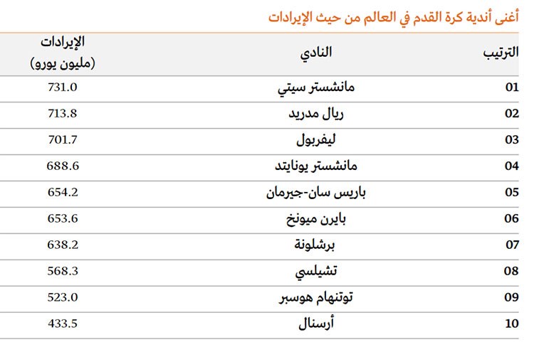 وجاء “ريال مدريد” في المركز الثاني، وكانت “باريس سان جيرمان” و”برشلونة” و”بايرن ميونخ” الفرق الوحيدة غير الإنجليزية في المراكز العشرة الأولى.