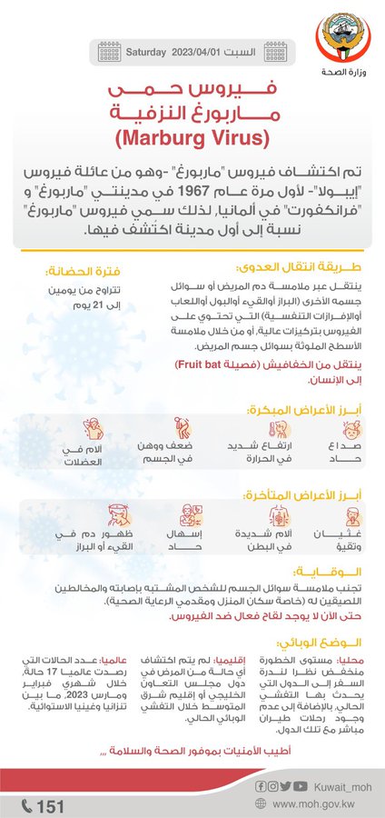 وبحسب منظمة الصحة العالمية فإن مرض فيروس ماربورغ الذي كشف عنه للمرة الأولى في 1967 تتراوح فترة حضانته ما بين يومين و 21 يوما وتصل نسبة الوفيات بسببه إلى 88 في المئة. وينتشر الفيروس بملامسة دم شخص مصاب بالعدوى أو إفرازاته أو أعضائه أو أي سوائل أخرى تفرز من جسده أو ملامسة أسطح أو مواد ملوثة بهذه السوائل.