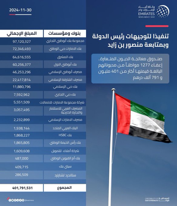 أعلن صندوق معالجة الديون المتعثرة في الإمارات عن إعفاء 1277 مواطناً من مديونياتهم التي تتجاوز قيمتها 401 مليون درهم، وذلك بالتعاون مع 18 بنكاً ومصرفاً ومؤسسة في الدولة، وذلك بتوجيهات من رئيس الإمارات الشيخ محمد بن زايد.