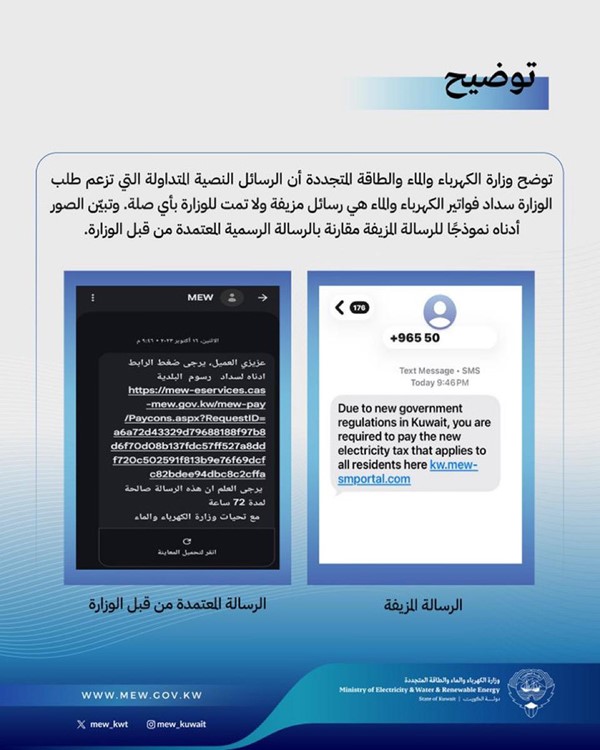وبينت الوزارة في حسابها على منصة اكس الفرق بين الرسائل المزيفة والرسائل الرسمية المعتمدة من قبلها