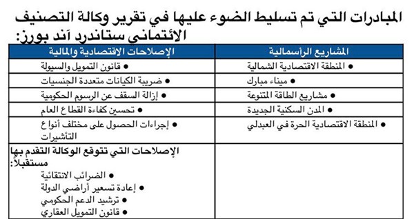كما بيّنت الوكالة أن الإصلاحات الداعمة للنمو غير النفطي تشمل تطبيق ضريبة الشركات متعددة الجنسيات وتعديل رسوم الخدمات العامة وتحسين كفاءة منظومة المشتريات الحكومية، كما تتابع الوكالة عدداً من الإصلاحات قيدالتنفيذ، بما في ذلك الضرائب الانتقائية، إعادة تسعير أراضي الدولة، ترشيدالدعم، وتعزيز كفاءة القوى العاملة في القطاع العام.