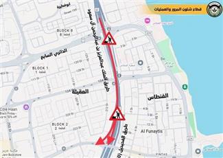 أعلنت الإدارة العامة للمرور عن إغلاق الحارة اليمنى والحارة الوسطى مع إغلاق تقاطع العقيلة والفنطاس، على طريق الملك عبدالعزيز بن عبدالرحمن آل سعود ( طريق الفحيحيل ) للقادم من مدينة الكويت بإتجاه الفحيحيل، وذلك اعتباراً من يوم الإثنين الموافق 2025/12/8 وحتى يوم الثلاثاء الموافق 2025/12/23.