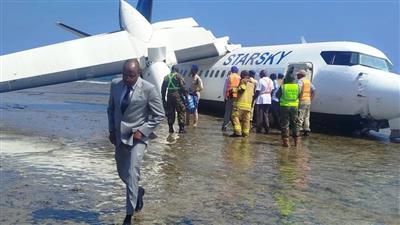 وأفادت وسائل إعلام محلية بأن قائد الطائرة حاول العودة إلى المطار لتنفيذ هبوط اضطراري، إلا أن الطائرة، وهي من طراز «فوكر 50» وتابعة لشركة «ستار سكاي»، خرجت عن المدرج وسقطت على شاطئ قريب من محيط المطار.