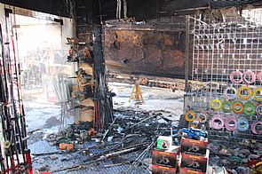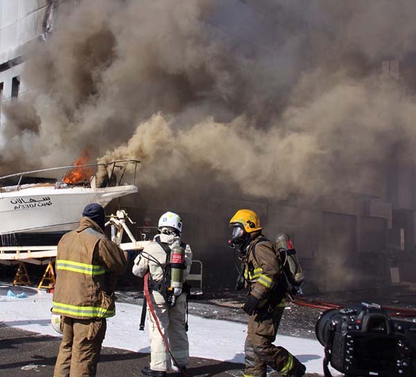 وعند الوصول للموقع تبين بأن ألسنة اللهب قد امتدت من القارب لتصل إلى الورشة وجزء من واجهة المبنى بعد ان حدث انفجار صادر من خزان الوقود وتلاه حريق.